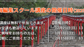 未分類 ■【冬季】動画編集スクール~第1回無料開催(2025~2026年度) 朝晩の冷え込みが一段と厳しくなり、日中との気温差も大きくなる季節です。教室内は快適にお過ごしいただけるよう環境を整えておりますので、どうぞ体調管理にご留意ください秋季は以下の日程で開催いたします。 初回は動画編集、Youtubeの基... 2025.11.18 未分類
